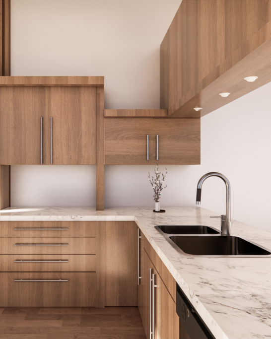 La cocina se convierte en una extensión del espacio, sin cortes ni elementos innecesarios, todo completamente personalizable.